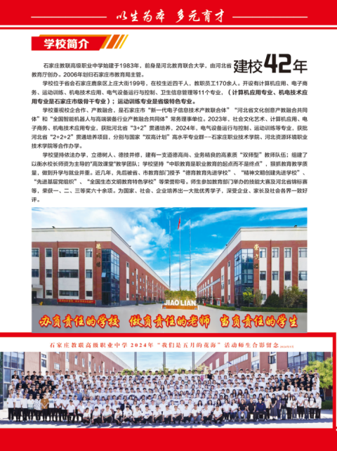 石家莊教聯(lián)高級職業(yè)中學(xué),作為省級重點(diǎn)中學(xué),自 1983 年創(chuàng)立以來,建校42年,始終致力于為學(xué)生提供優(yōu)質(zhì)的職業(yè)教育與升學(xué)渠道。2025 年秋季招生現(xiàn)已全面開啟,期待有志青年的加入!